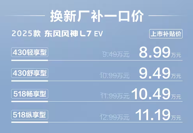 而把厂补价格卖到8.99万起的新款风神L7,也能实现类似的效果。就如开头所说,虽然纯电续航只有430公里,但它的价格反而比插混版更便宜。这个时候如果横向对比,可以发现很多小尺寸的纯电代步车,高配400公里的版本也要八万多了,那么对于那些更注重空间的用户,就不如一步到位选择价格贵不了多少,尺寸却达到A+级水准的新款风神L7 EV版本。
