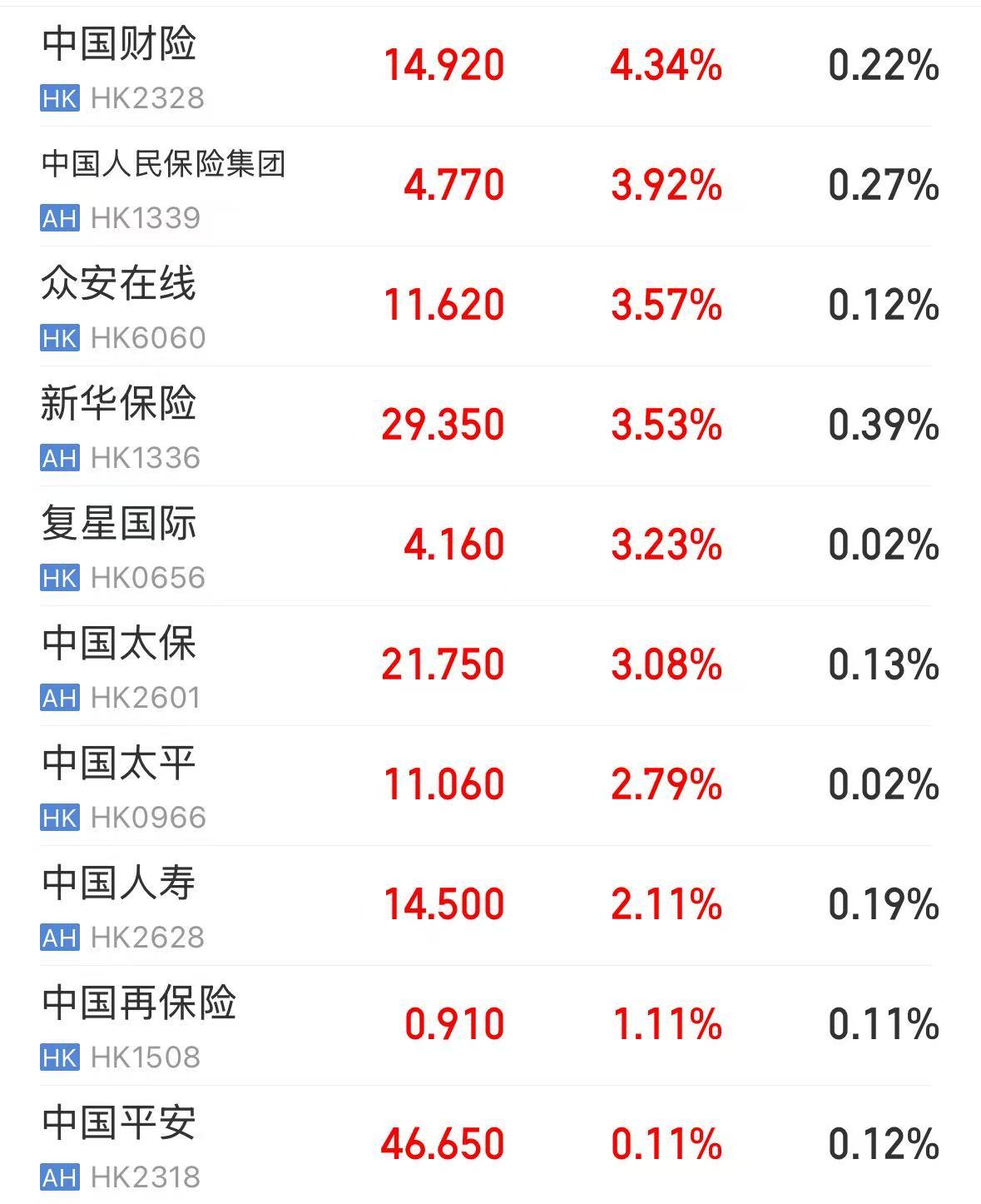 保险股开盘拉升,中国财险涨超4%,中国人民保险集团、众安在线、新华保险、复星国际、中国太保涨超3%。