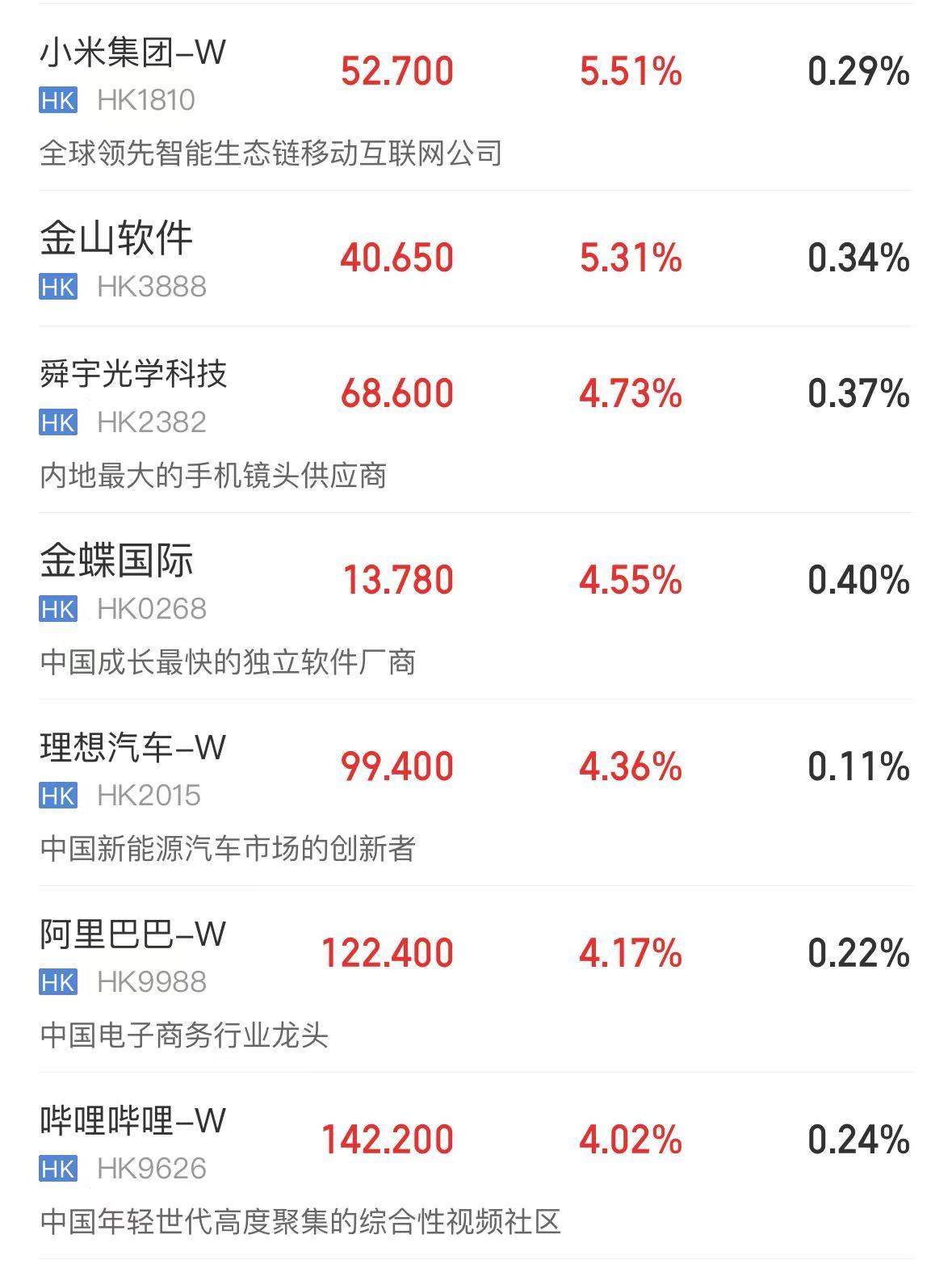 盘面上,科网股全线上涨,小米集团涨超5%,阿里巴巴、哔哩哔哩涨超4%,快手、联想集团、京东集团涨超3%;
