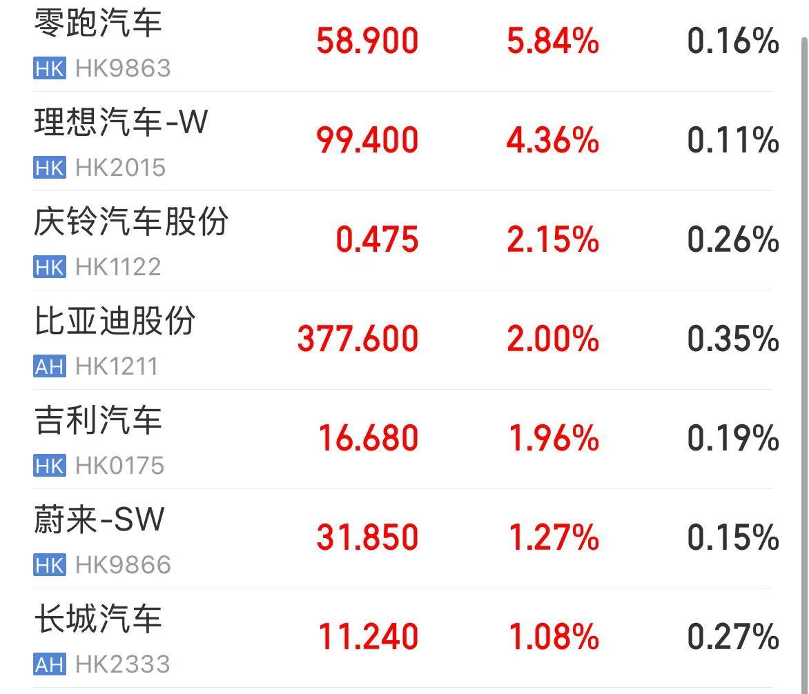 新能源车企股集体走高,小鹏汽车涨超7%,零跑汽车涨超5%,理想汽车涨超4%,比亚迪股份涨2%,吉利汽车、蔚来、长城汽车涨超1%。