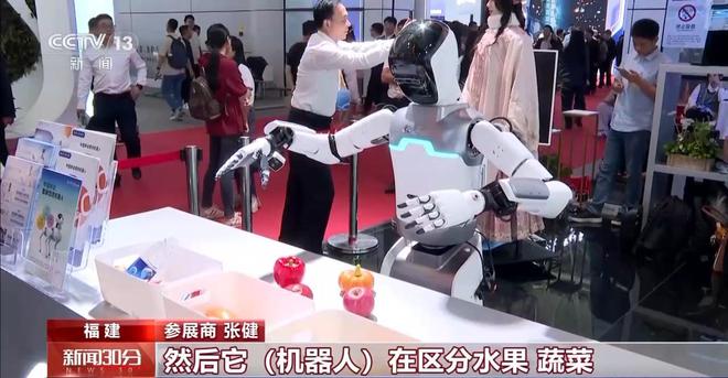 参展商 张健:我们正在进行一个厨房收纳的功能演示,机器人在区分水果、蔬菜以及杂物。机器人背后集成了我们的具身智能大模型,我们通过几十万条的实体操作数据对它进行训练。