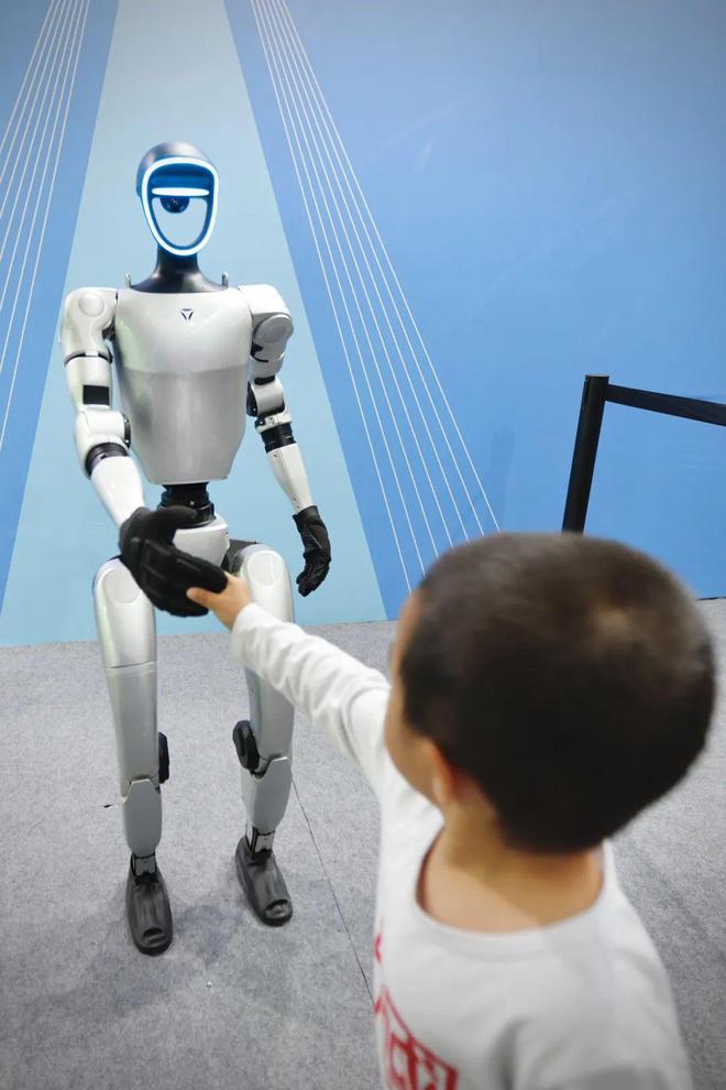 在“心象家园”展区,身高1.27米的宇数科技人形机器人G1,就在现场迎接大小朋友的到来,不仅带来互动表演,还能与它“握握手”。