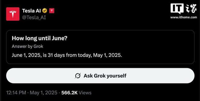 特斯拉在 5 月 1 日发布了一条含糊的推文,推文询问离 6 月还有多久,Grok 则回答还有 31 天,暗示 Robotaxi 服务可能于 6 月 1 日正式上线。尽管这一推测尚未得到官方明确确认,但这是特斯拉首次就 Robotaxi潜在的上线时间做出暗示。