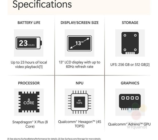其配置与12 英寸 Surface Pro 基本一致,均采用了 8 核的骁龙 X Plus 处理器(X1P-42-100,3.4GHz),同时配备了 16 GB 内存、256 或 512 GB 的 UFS 闪存。
