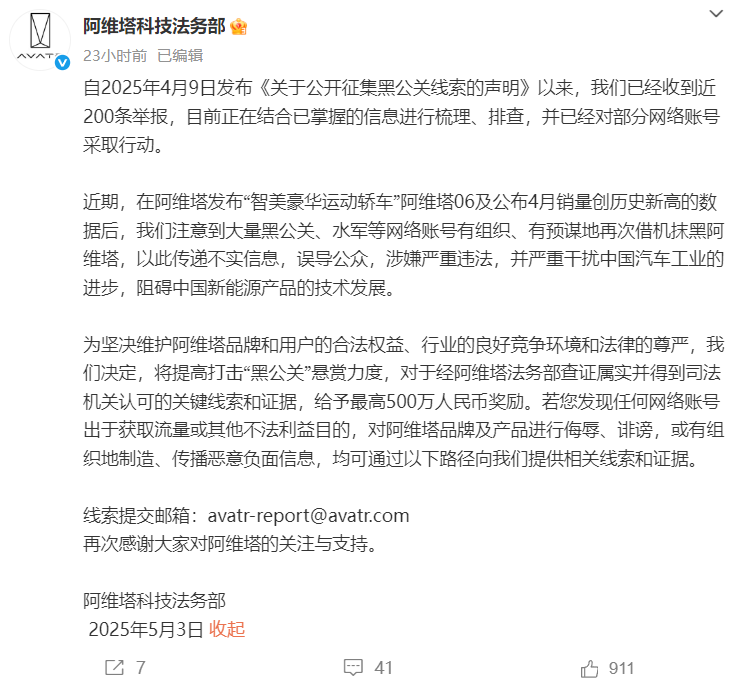 此外,5月3日晚,阿维塔法务部进一步宣布提高打击“黑公关”悬赏力度,对于查证属实并得到司法机关认可的关键线索和证据,将给予最高500万元人民币奖励。