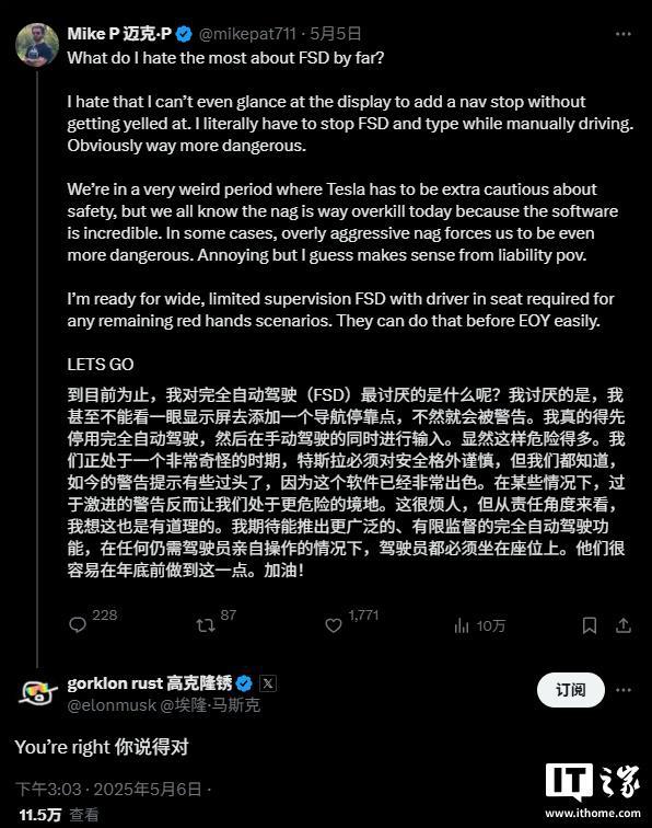 有网友在 X 上发帖吐槽称最讨厌 FSD 的驾驶员监控功能,甚至不能看一眼显示屏去添加一个导航停靠点,不然就会被系统警告。不得不停止使用 FSD,然后在手动驾驶的同时打字输入,显然这样要危险得多。该网友称,“我们正处在一个非常奇怪的时期,特斯拉必须对安全格外谨慎,但我们都知道,如今这种提醒太过了,因为其软件已经非常出色。在某些情况下,过于激进的提醒反而会让我们处于更危险的境地。”
