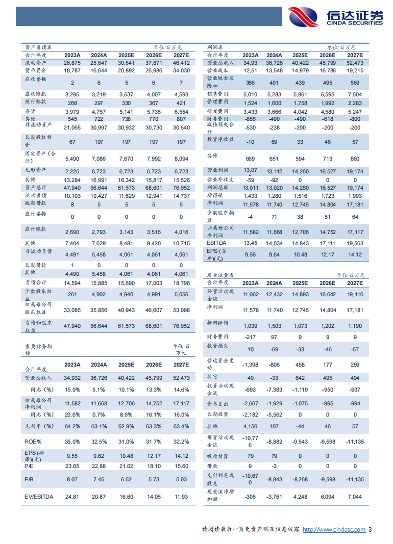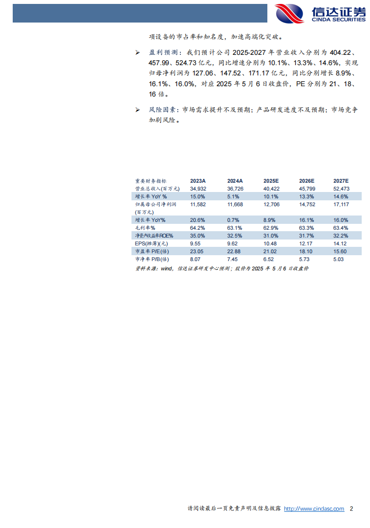盈利预测:盈利预测:我们预计公司2025-2027年营业收入分别为404.22、457.99、524.73亿元,同比增速分别为10.1%、13.3%、14.6%,实现归母净利润为127.06、147.52、171.17亿元,同比分别增长8.9%、16.1%、16.0%,对应2025年5月6日收盘价,PE分别为21、18、16倍。
