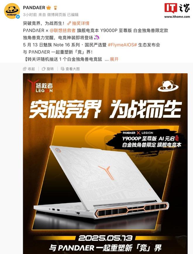 IT之家 5 月 9 日消息,魅族 PANDAER 宣布与联想合作推出一款拯救者Y9000P 至尊版AI元启白金独角兽限定电竞本,可以看作是普通版笔记本换上“灵龙限定涂装”,将于 5 月 13 日与魅族Note 16系列手机同台登场。