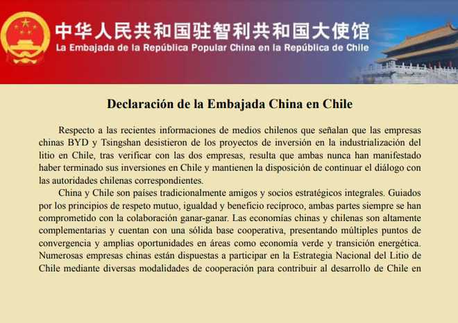 中国驻智利大使馆5月9日发布声明称,关于近期有关“比亚迪和青山控股退出在智利锂电产业化投资项目”的相关报道,经向两家公司核实,两家公司从未声明终止在智利投资,愿同智利有关部门继续对话。