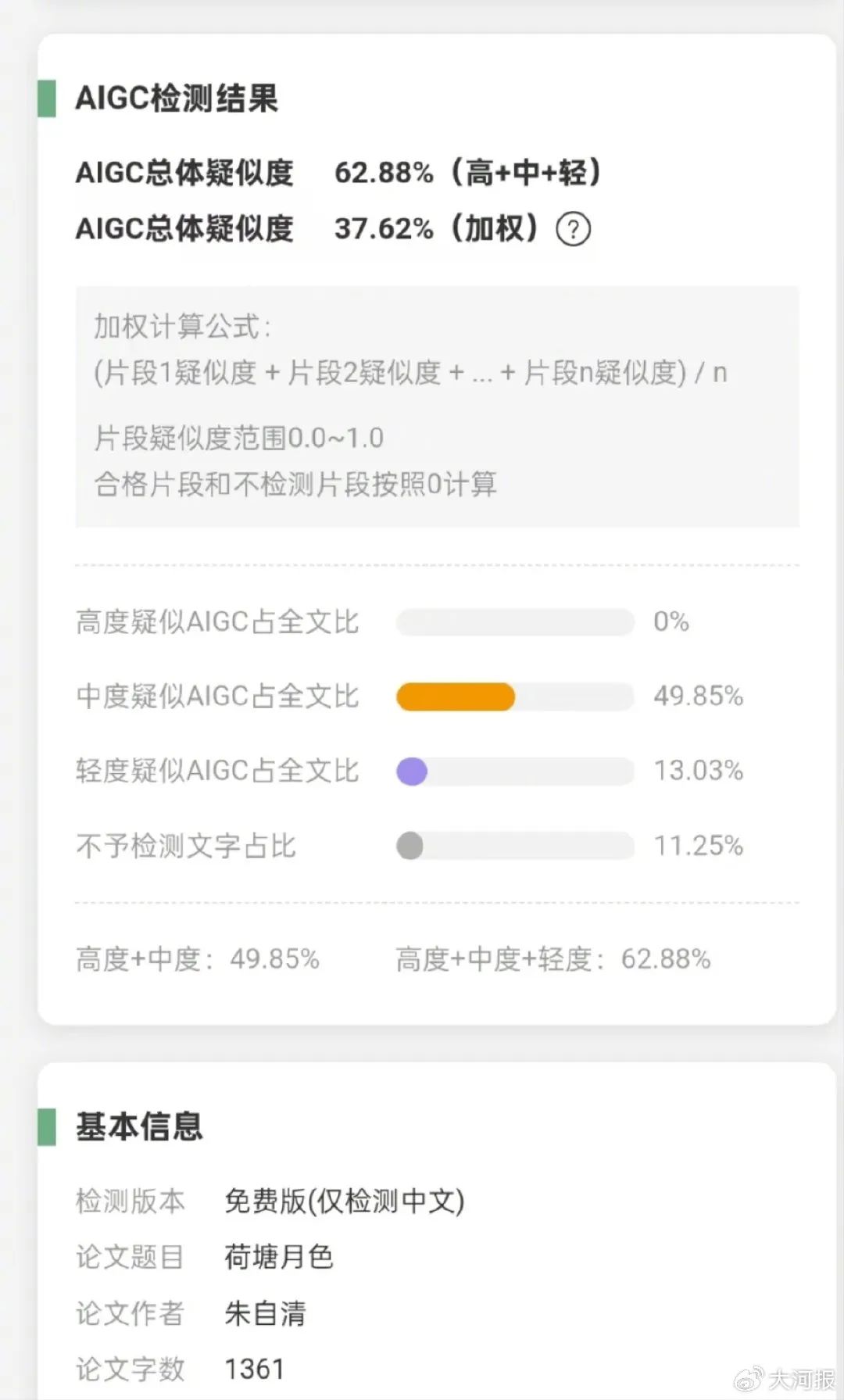 据大河报消息,将朱自清的名篇《荷塘月色》与刘慈欣《流浪地球》的片段上传至某常用论文检测系统后,结果显示,这两篇经典作品AI生成内容总体疑似度竟分别达到了62.88%和52.88%。