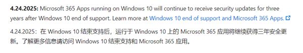 微软在相关文档中解释:"为了帮助您在升级到Windows 11期间保持安全,我们将继续为Windows 10上的Microsoft 365应用提供安全更新,这些更新将通过标准更新渠道提供,直至2028年10月10日。"