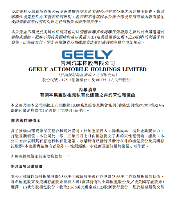 5 月 7 日,吉利汽车正式递交对极氪私有化建议的非约束性报价函,建议以每股极氪股份 2.566 美元或美股美国存托股票 25.66 美元的价格,收购极氪已发行的所有股份。