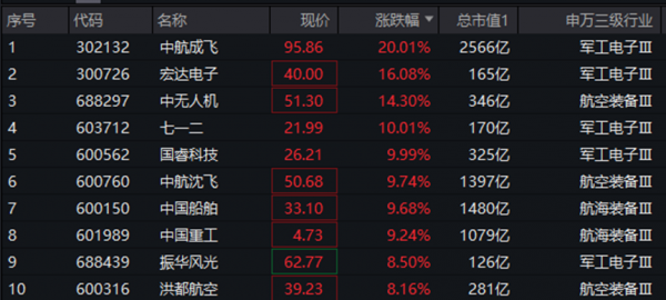 80只成份股涨幅中位数超44%,中航成飞再度冲击20CM涨停,宏达电子、中无人机涨超14%,七一二、国睿科技双双涨停封板,千亿市值权重股中航沈飞、中国船舶、中国重工涨超9%。
