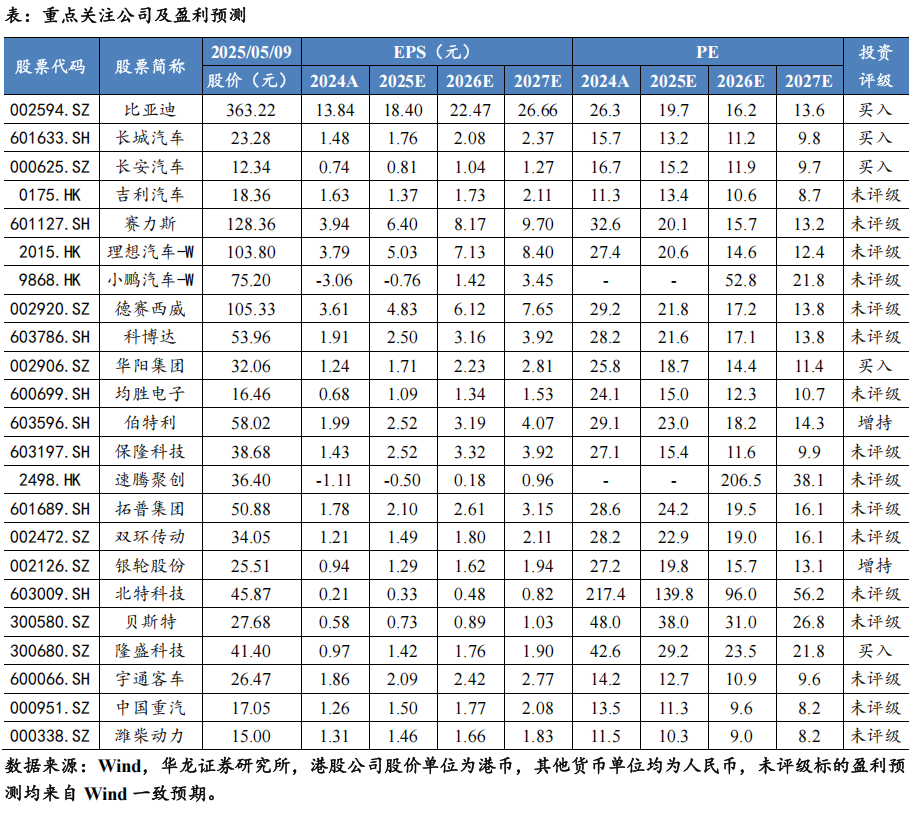 吉利计划全资控股极氪,体系整合应对市场淘汰期。5月7日,吉利汽车向公司控股美股上市子公司极氪提交了非约束性报价函,建议以每股极氪股份/美国存托股票2.566/25.66美元或1.23/12.3股新发行股份进行收购,初步进行私有化建议。极氪的私有化有望实现内部资源整合,减少关联交易,在当前乘用车市场淘汰期聚焦资源利用率的最大化。若极氪完成私有化退市,吉利旗下银河、极氪和领克等主销品牌将统一在同一港股上市公司运营,极氪及领克品牌自由度相对增强,吉利有望整合产业链零部件公司,精简冗员的同时协同采购,释放规模效应。吉利于2025年4月成立负责集团电池业务的吉曜通行,在极氪私有化完成后有望整合极氪控股的新能源三电系统公司威睿电动旗下电池业务。除零部件公司外,营销体系和售后网络运营等由集团公司统一规划也有望提升当前极氪独立运营下的效率。展望2025年,极氪&领克发力高端市场,吉利银河新车储备丰富且均价较星愿等此前主销车型提升明显,新车&私有化效率提升双重推动下公司单车盈利有望持续提升。