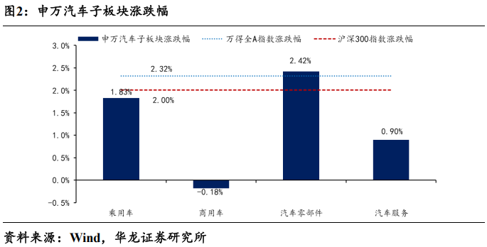 行业方面,本周(2025年5月6日至5月9日)申万汽车板块涨跌幅+2.03%,涨跌幅在31个行业中排名第14。细分板块中,乘用车板块涨跌幅+1.83%,商用车板块涨跌幅-0.18%,汽车零部件板块涨跌幅+2.42%,汽车服务板块涨跌幅+0.90%。同期沪深300涨跌幅+2.00%,万得全A涨跌幅+2.32%。