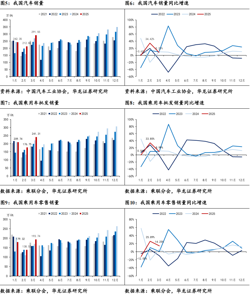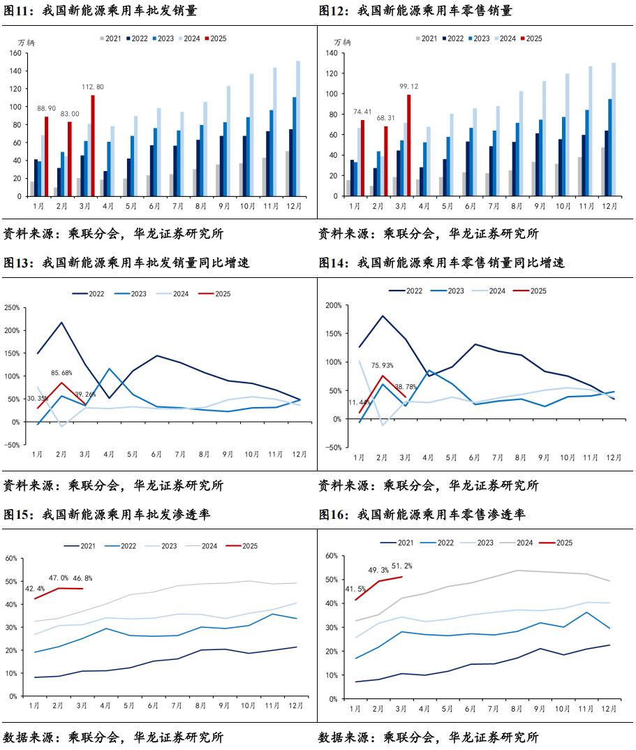 3月乘用车零售销量同比+14.25%。据中汽协数据,2025年3月,我国汽车销售完成291.55万辆,同比+8.20%,环比+36.97%。据乘联分会数据,2025年3月乘用车批发销量完成241.31万辆,同比+8.99%,环比+36.52%,乘用车零售销量完成193.74万辆,同比+14.25%,环比+39.87%。3月5日,李强总理在两会上作《政府工作报告》,提出了全年5%左右的GDP增速目标,汽车作为国家的支柱性产业之一,全年销量增长稳健和鼓励政策可期。国家以促消费为主要目标,安排了3,000亿元的超长期特别国债支持消费品以旧换新,对全年的乘用车市场构成强有力的支撑。在国家促消费政策推动下,很多省市出台并逐步落实了相应促消费政策,叠加车展、主机厂厂补加码等线下活动的全面启动,3月车市开局走势良好。随着节前的燃油车消费潮转为节后的新能源消费潮,新能源渗透率持续提升,新能源车成为春季乘用车市场恢复的主要驱动力。