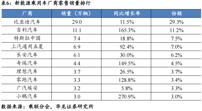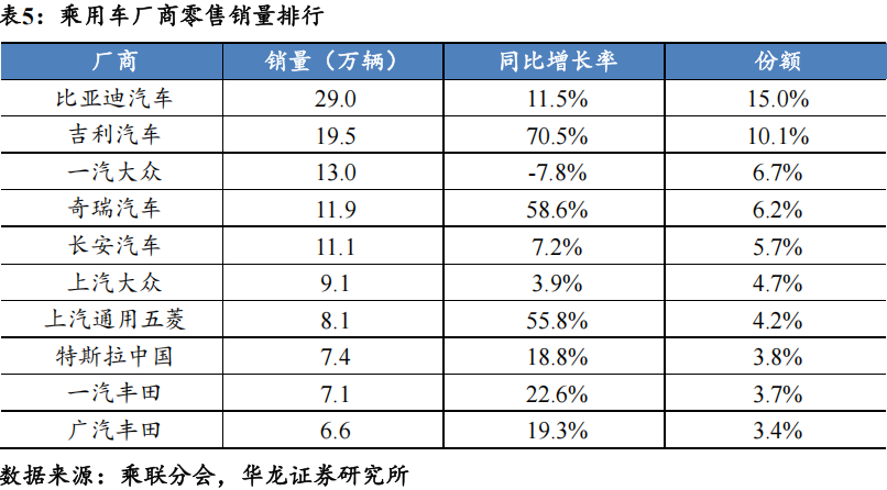 乘用车销量排名前10厂商合计市占率63.5%。分厂商来看,比亚迪汽车/吉利汽车/一汽大众分别以29.0/19.5/13.0万辆分列乘用车零售厂商销量前三位。自主厂商比亚迪汽车/吉利汽车/长安汽车/奇瑞汽车销量同比+11.5%/+70.5%/+7.2%/+58.6%。