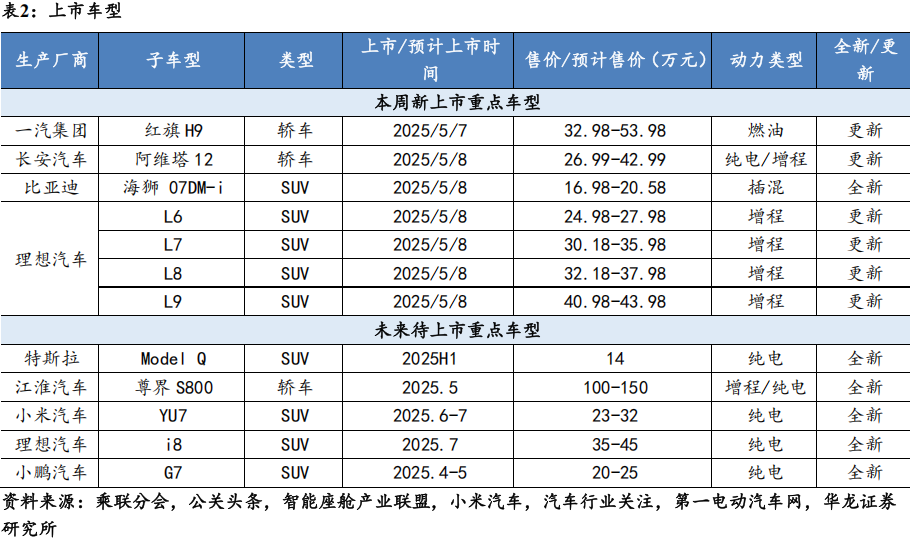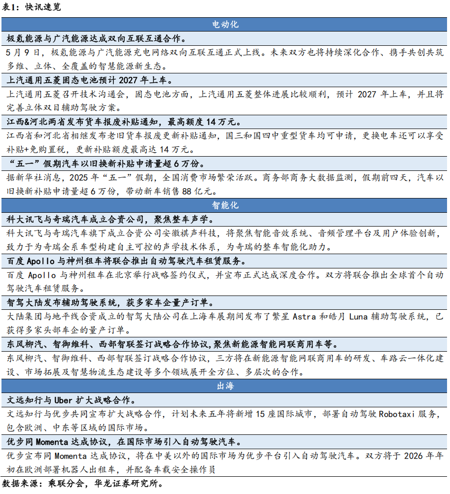 行业动态:行业要闻,一是阶段性将汽车金融公司存款准备金率从5%调降至0%,有望进一步刺激汽车消费需求;二是小马智行与Uber合作,将率先在中东市场部署Robotaxi。上市车型,比亚迪海狮07DM-i、理想L6&7&8&9等车型上市。