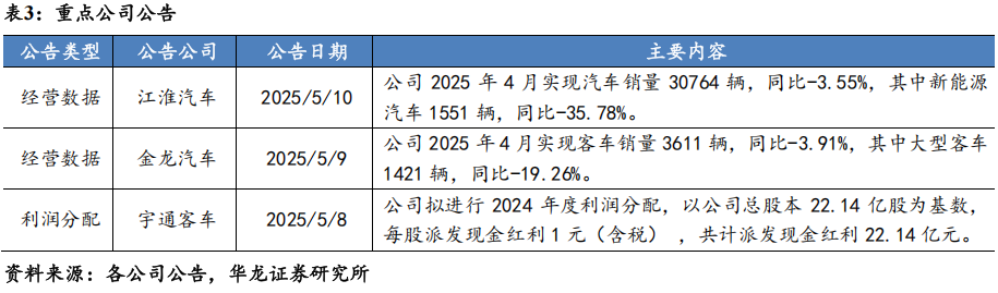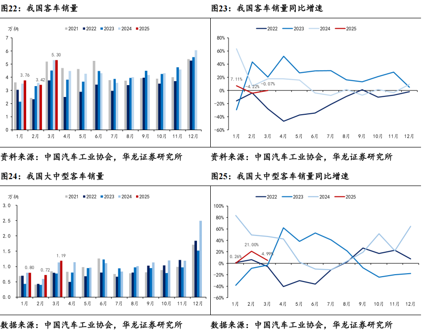 3月客车销量同比微降。客车方面,据中汽协数据,2025年3月客车销量完成5.30万辆,同比-0.07%,环比+55.18%。2025年3月,大中型客车销量完成1.19万辆,同比+4.99%,环比+65.14%。大中型客车销量同环比双增,主要系政策与市场的双重推动。政策方面,国家延续新能源补贴政策,并加大对公共交通升级的投入力度,同时地方“以旧换新”政策相继落地,这些举措直接激发了消费者的购车需求。市场方面,春节后消费市场逐渐回暖,经济活动日益复苏,带动了企业的采购需求。