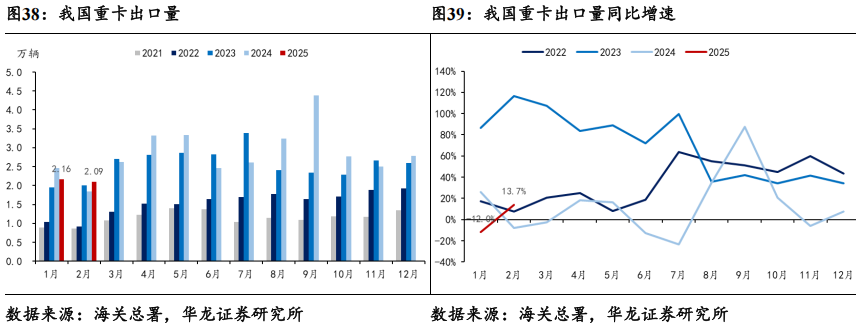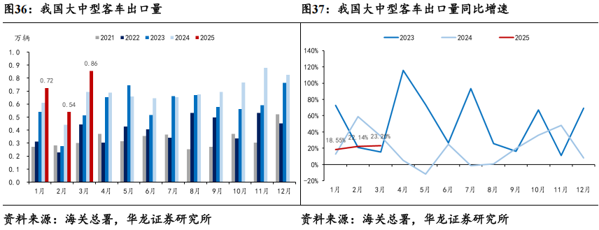 3月大中型客车出口量同比实现增长。据海关总署数据,2025年3月大中型客车出口销量完成0.86万辆,同比+23.20%,环比+58.52%;2025年2月重卡出口销量完成2.09万辆,同比+13.74%,环比-3.25%。