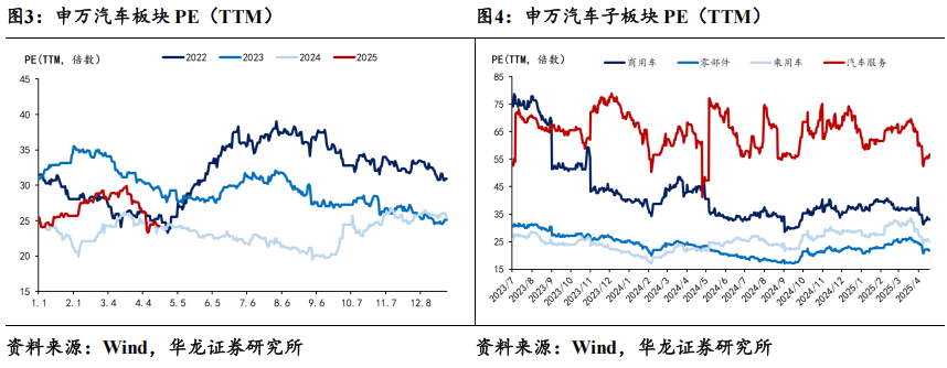 估值方面,截至2025年5月9日收盘,申万汽车板块PE为26.1倍, 较上周环比下跌。子板块中,乘用车/商用车/汽车零部件/汽车服务板块PE为26.6/34.6/24.3/49.2倍。