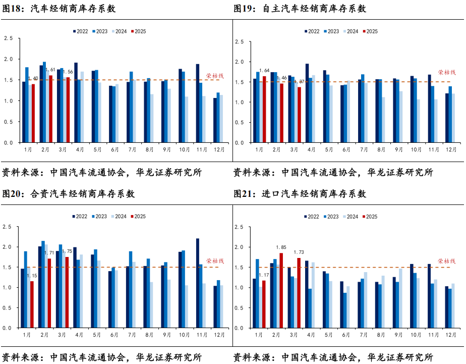 3月库存水平处于合理区间。据中国汽车流通协会数据,2025年3月份汽车经销商综合库存系数为1.56,同比基本持平,环比-3.11%。库存水平环比2月略微降低。其中自主品牌库存系数为1.37,同比-8.05%,环比-6.16%;合资品牌库存系数为1.75,同比-7.89%,环比+2.34%;进口品牌库存系数为1.73,同比+40.65%,环比-6.49%。