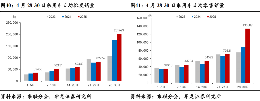 据乘联分会数据,4月28-30日,乘用车市场零售销量完成40.0万辆,同比+50%,较上月同期基本持平;乘用车批发销量完成60.5万辆,同比+18%,较上月同期+10%。