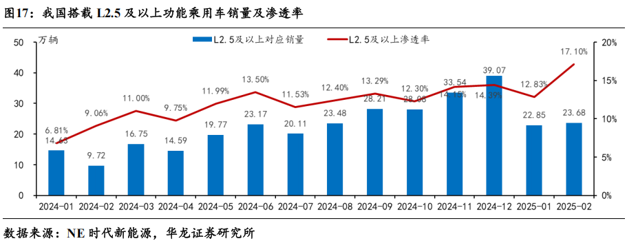 2025年2月L2.5及以上智驾渗透率达17.10%,创历史新高。据NE时代新能源数据,2025年2月搭载L2.5及以上智驾系统乘用车零售销量达23.68万辆,渗透率17.10%。2025年搭载L2.5及以上智驾系统乘用车累计销量46.53万辆,累计渗透率15.09%。随着传统自主车企等逐步将高速/城区NOA等高阶智驾功能下放至10万元级别车型,2025年L2.5及以上渗透率有望快速提升。