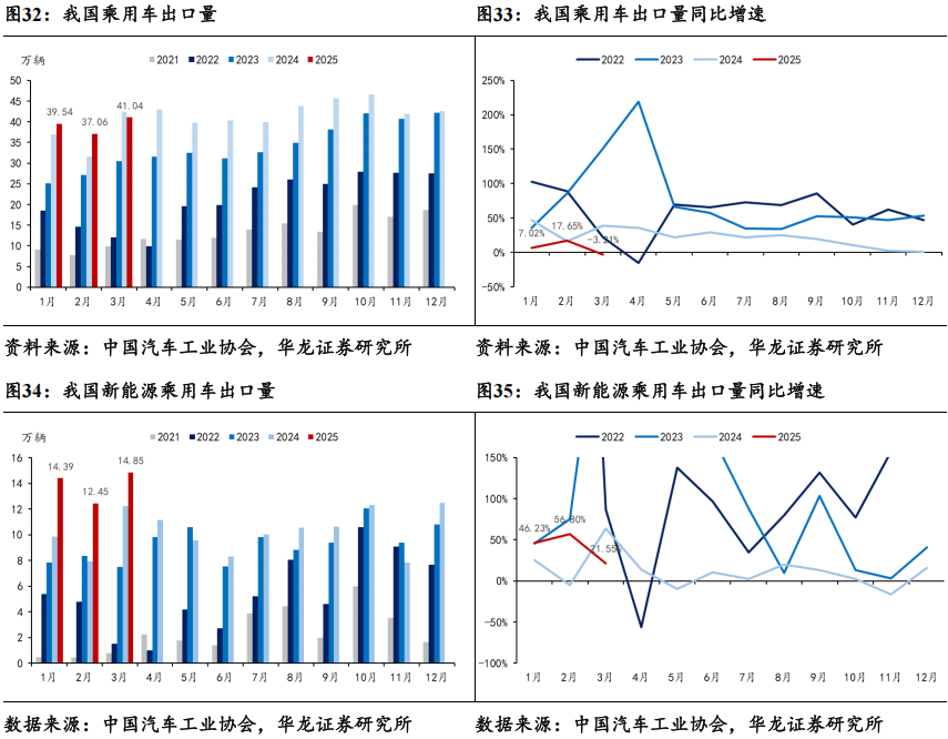 合资品牌反向出口下滑拖累3月乘用车出口数据。据中汽协数据,2025年3月乘用车出口销量完成41.04万辆,同比-3.21%,环比+10.74%。其中新能源乘用车出口销量完成14.85万辆,同比+21.55%,环比+19.34%。乘用车出口销量下滑或受合资品牌方向出口数据下滑拖累。据乘联分会数据,3月我国合资/自主品牌出口销量分别同比+1%/-45%,自主品牌保持出口销量增长。