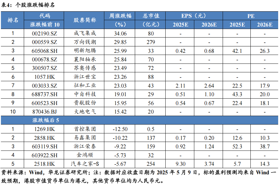 个股方面,本周260只个股上涨,49只个股下跌,涨跌幅前五的个股为成飞集成(+34.06%)、万向钱潮(+29.85%)、明新旭腾(+25.99%)、襄阳轴承(+25.84%)、苏奥传感(+23.49%);涨跌幅后五的个股为首控集团(-12.50%)、易鑫集团(-10.22%)、浙江荣泰(-9.22%)、金鸿顺(-5.73%)、汽车之家-S(-5.67%)。