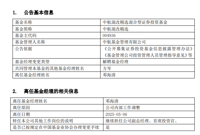 知名经济学家邓海清因公司内部工作调整卸任中航混改精选(004936)基金经理一职,转而由方岑单独管理,他本人则继续担任中航基金副总经理及首席投资官,但名下已无在管基金。