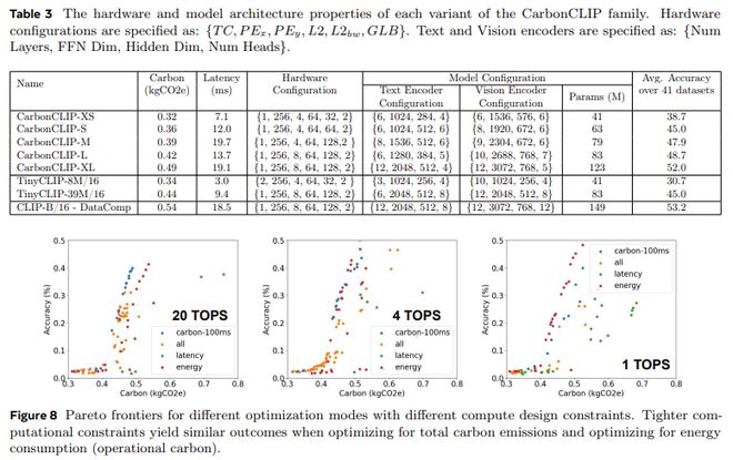 特别针对边缘推理设备,CATransformers 通过剪枝大型 CLIP 模型生成变体,并结合硬件估算工具分析碳排放与性能。其成果 CarbonCLIP-S 与 TinyCLIP-39M 精度相当,但碳排放降低 17%,延迟控制在 15 毫秒内;CarbonCLIP-XS 则比 TinyCLIP-8M 精度提升 8%,碳排放减少 3%,延迟低于 10 毫秒。