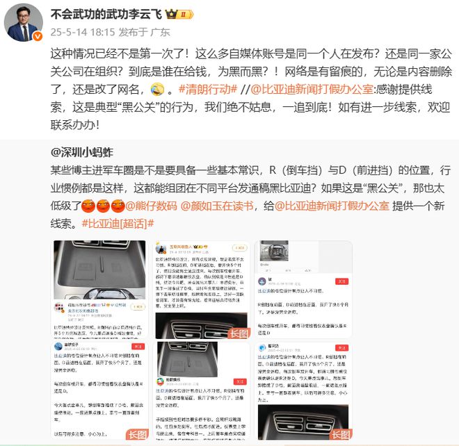 电动知家消息,近期,比亚迪品牌及公关处总经理李云飞针对网络上的黑公关行为再次发声,明确表示“绝不姑息,一追到底”。此次事件的起因是有网友向比亚迪新闻打假办公室提供线索,称一些自媒体账号在网络上吐槽比亚迪倒车挡与前进挡的位置设计有误,声称“R挡在前,D挡在后的设计违反常规”,这种说法明显违背了行业常识。