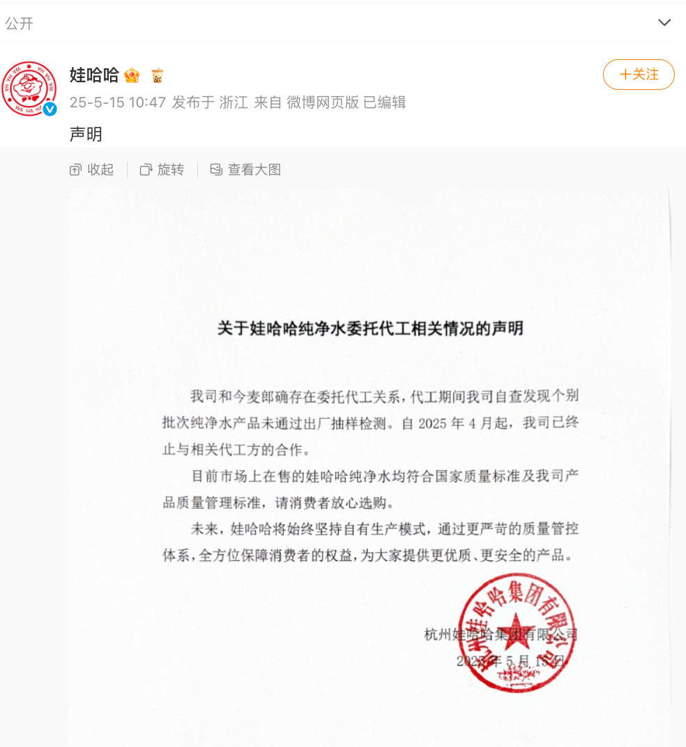 5月15日上午,娃哈哈集团官方微博发布声明称,公司和今麦郎确存在委托代工关系,代工期间公司自查发现个别批次纯净水产品未通过出厂抽样检测。自2025年4月起,公司已终止与相关代工方的合作。娃哈哈在声明中表示,“目前市场上在售的娃哈哈纯净水均符合国家质量标准及我司产品质量管理标准,请消费者放心选购。”