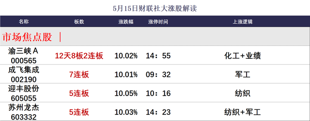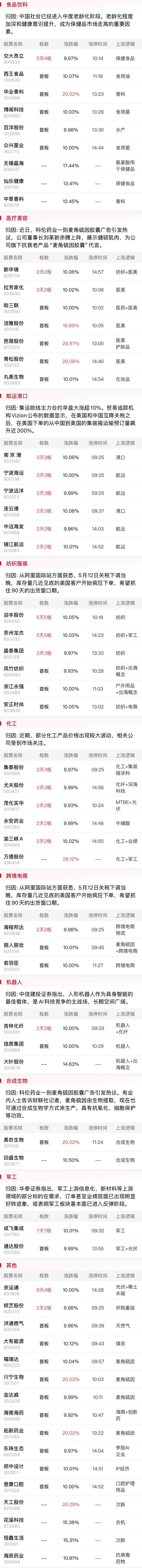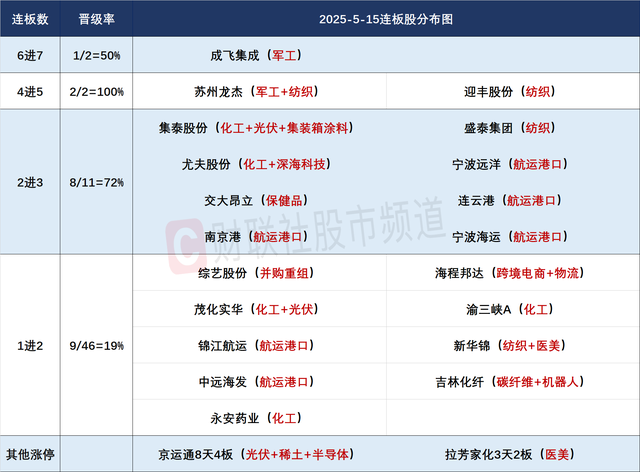 贸易追踪机构Vizion公布的数据显示,在美国和中国互降关税之后,在美国下单的从中国到美国的集装箱运输预订量飙升近300%。受益关税缓和带动的抢运逻辑,航运、物流板块持续站上风口,宁波海运、宁波远洋在内的大批前排人气股悉数实现连板晋级,进而刺激同属出口链的纺织服装板块得到资金回流,迎丰股份、苏州龙杰两只连板高标走出分歧转一致晋级5连板,昨日完成反包的华纺股份一度触及涨停。板块内前排股的高晋级率反映目前整个出口链仍处于加速向上阶段,但连续高潮后仍难免出现分歧,关注几只10厘米前排股中能否出现类似军工板块中利君股份的分歧转一致品种对板块继续形成拔高。