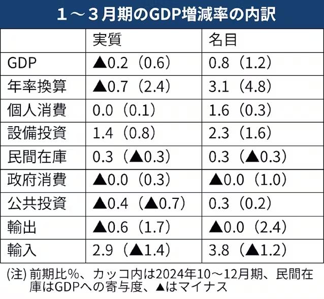 《日本经济新闻》发布的日本1季度GDP增减率的详细情况,其中括号内是2024年第四季度的数据,代表负数。 《日本经济新闻》