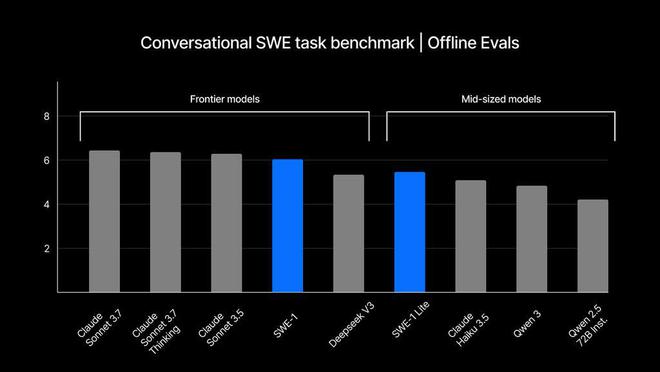 Windsurf 透露,旗舰型号 SWE-1 在内部编程测试中表现出色,可与 Claude 3.5 Sonnet、GPT-4.1 和 Gemini 2.5 Pro 等主流模型一较高下,但面对如 Claude 3.7 Sonnet 这样的前沿模型,其在软件工程任务上的表现仍有差距。IT之家附上相关图标如下:
