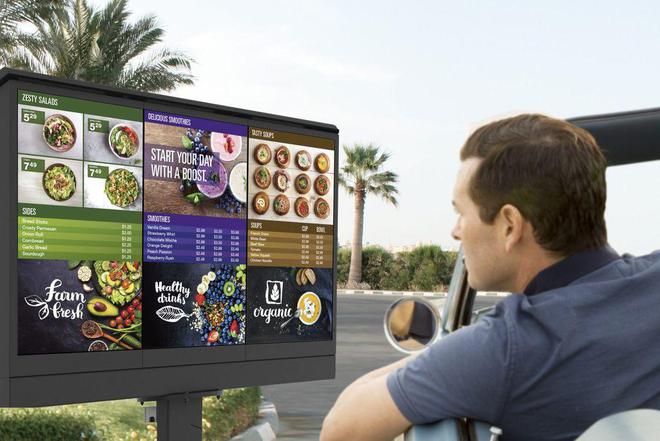 这款 55 英寸 OH 系列户外显示屏,采用 QBC 系列 4K UHD 显示屏,将展示 Voice Insights(语音洞察)、Smart Lane(下一代得来速解决方案)等功能。