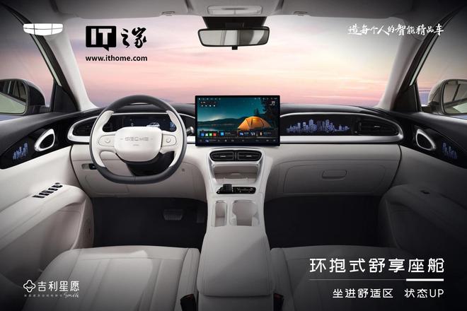 吉利星愿长宽高分别为4135/1805/1570mm,轴距 2650mm,提供平底式双辐多功能方向盘、8.8 英寸液晶仪表盘、14.6 英寸1080P 60Hz中控,内置 Flyme Auto 车机系统。内饰提供天镜白、仙踪绿两种座舱配色,高配版车型支持侧安全气帘、360 度全景影像 + 透明影像、手机无线充电等功能。