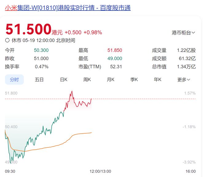 市场方面,小米集团(01810.HK)水下走强翻红,早盘一度跌超3%。截至发稿,报51.5港元,涨0.98%。