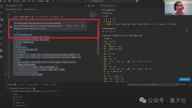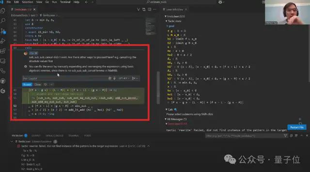 同时在证明不等式部分,陶使用了计算块(calc block)来构建不等式链。虽然Copilot自动生成了基本结构,但在绝对值符号处理和最终步骤上出现了偏差。