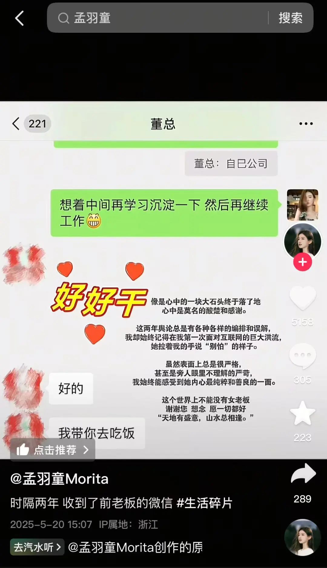 据悉,20日下午,孟羽童在社交媒体账号上分享了一张图片,并配文称:“时隔两年,收到了前老板的微信。”图片显示对话对方为“董总”,称“我带你去吃饭”。