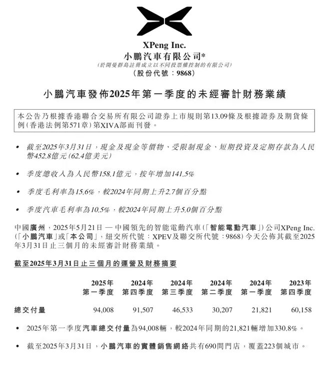 5月21日,小鹏汽车在港交所公告,,第一季度营收 158.1 亿元,去年同期 65.5 亿元,同比增长 141.5%;第一季度净亏损 6.60 亿元,相较去年同期 13.7 亿元、上一季度 13.3 亿元明显收窄;第一季度调整后每股亏损 0.22 元。该季度汽车总交付量 94008 辆,相较去年同期 21821 辆大增 330.8%。预计第二季度营收 175 亿元人民币至 187 亿元人民币;交付量 10.2 万至 10.8 万辆,同比增 237.7-257.5%。