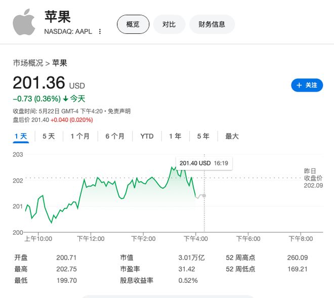 消息传出后,苹果股价周四下午曾短暂上涨,但最终收跌0.36%,报201.36美元。今年截至周三收盘,苹果股价已累计下跌19%。
