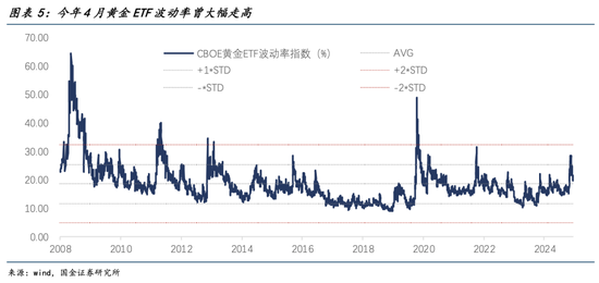短期内,黄金成了一切不确定性的“看涨期权”,市场弃美债、投黄金的情绪达到高潮。以散户和动量机构资金为代表的黄金ETF持有量一度快速攀升,推高了金价,也抬高了波动率。2025年4月25日,黄金ETF波动率一度升至2020年以来的93%分位数水平,2008年以来的85%分位数水平,黄金从名义上的避险资产变成了实质上的风险资产。