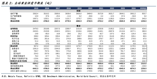 今年一季度推高黄金价格的主要需求来自于黄金ETF所代表的交易型资金(机构+散户),在2022Q2-2024Q2连续九个季度净抛售后,于2024年下半年方才重返市场,但在2025年一季度大买552吨(同比+170%)。