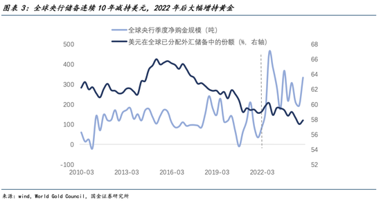 这一时期,黄金开始与美元脱钩,以美元计价的黄金价格大幅上涨。中国、土耳其等地缘大国以及新加坡为代表的地缘中立国的央行增加了黄金储备占比,是全球央行购金需求在2022年三季度后大幅上升的重要支撑。与此同时,2022-2024年美元在全球货币储备中的占比从60%小幅下降到58%。
