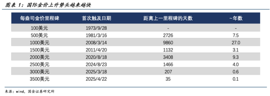 回首过去三年黄金里程碑式的牛市,每盎司金价从2000美元到2500美元耗时1466天,从2500美元到3000美元耗时207天,从3000美元到3500美元仅耗时35天。