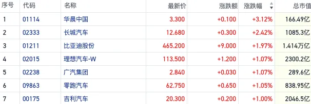 截至收盘,华晨中国(01114.HK)涨超3%,长城汽车(02333.HK)涨超2%,比亚迪(01211.HK)、理想汽车-W(02015.HK)等多家车企跟涨。