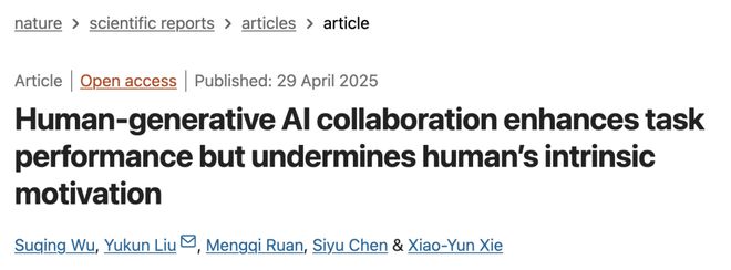 来自浙江大学管理学院特聘研究员、博士生导师刘玉坤团队在涉及3500多名参与者的研究中发现,使用 AI 后,人们的内在动力平均下降了11%,无聊感平均增加了20%。缺乏内在动力可能会导致脱节,降低工作满意度,甚至倦怠的负面后果。